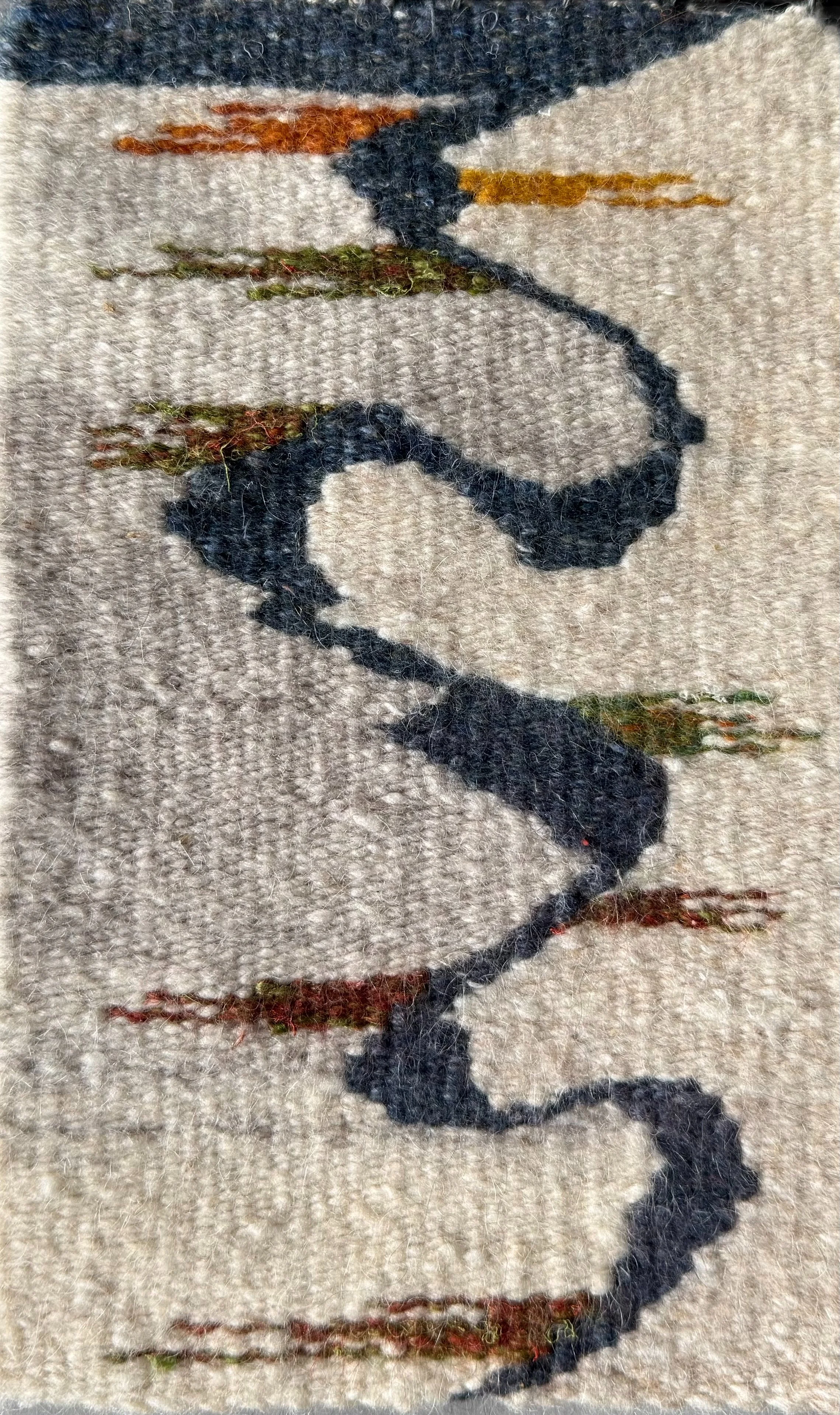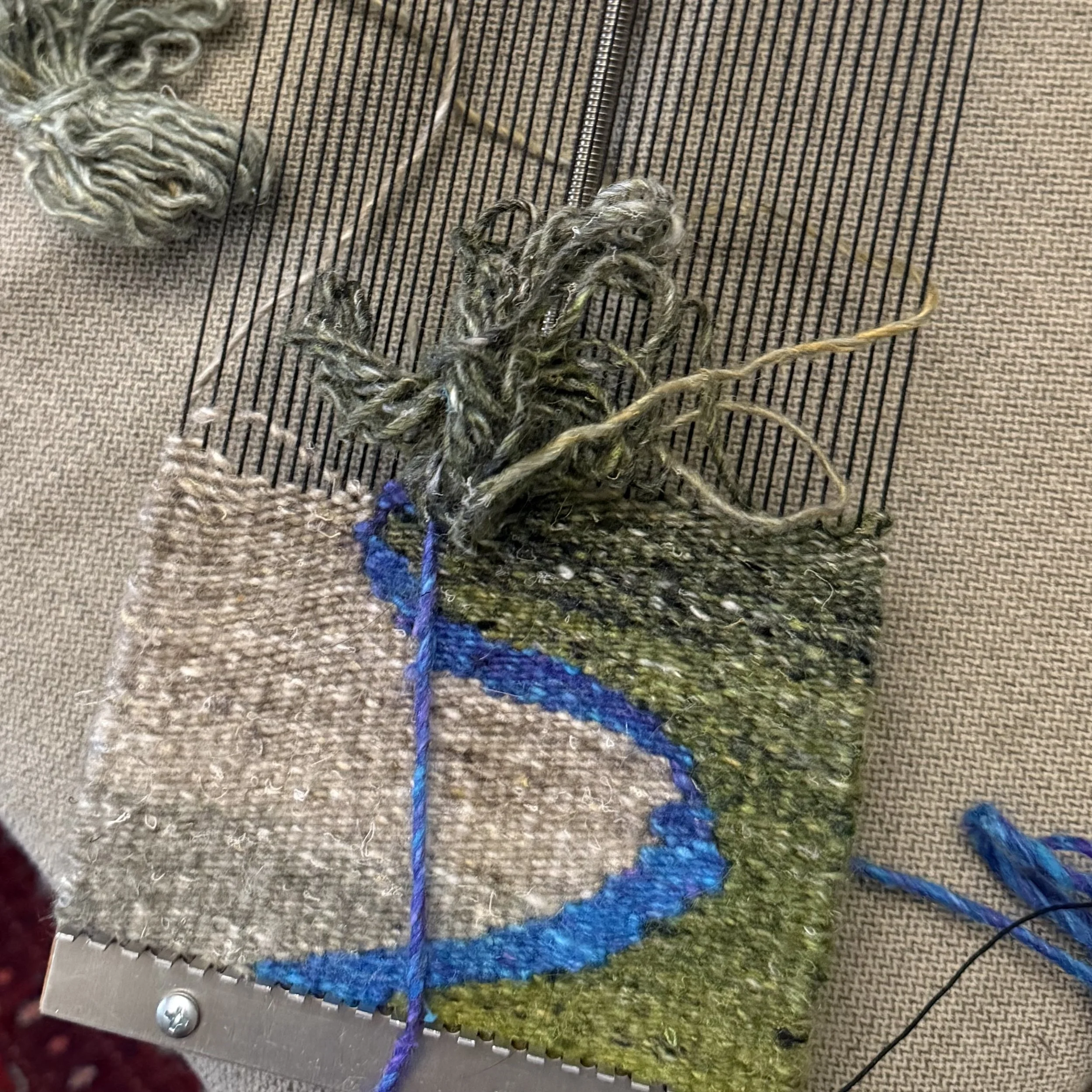 These tapestries are woven using wool and silk weft yarns on linen warp. They echo the subtle color shifts of the land, water, and sky. I think of them as postcards from familiar and imagined landscapes. Each is stitched onto a hand-forged hanger made by Hyland Forge in Portland, Oregon.